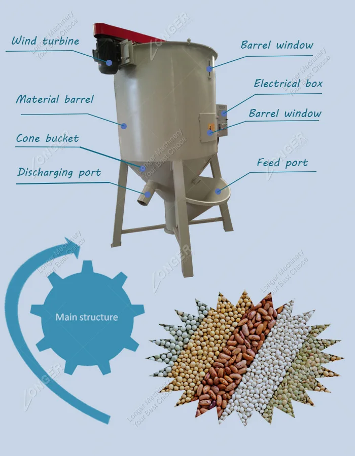 Corn grain dryer to dry wheat , corn , rice,hemp seed ,beans and so on.The agricultural dryer machine's design is of two level spiral quick delivery, The seed dryer machine's first level deliver the materials quickly into the barrel, and the almond dryer machine's second level continuously rapid lift the raw material to the dryer machine for corn's upper of the barrel and then throw the raw material with deliquescence scattered, while the hot air from the grain drying machine's center of the seeds drying equipment's barrel bottom blown out all around. Smoothly move the raw material from agricultural dryer's bottom to top to conduct a comprehensive heat transfer and dynamic drying process.