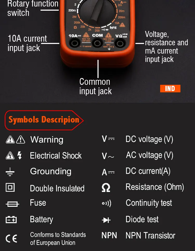 DC Current,Resistance, Continuity, Diodes, Transistor hFE and so on. The Meter complies