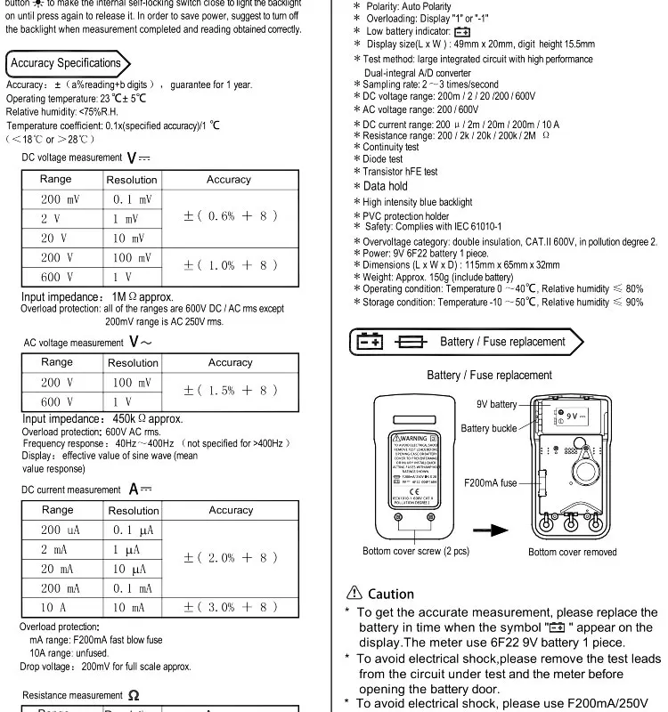 | Measuring Resistance Range: | 200 -2M; | DC Current: | 200μ/2m/20m/200m/10A; |