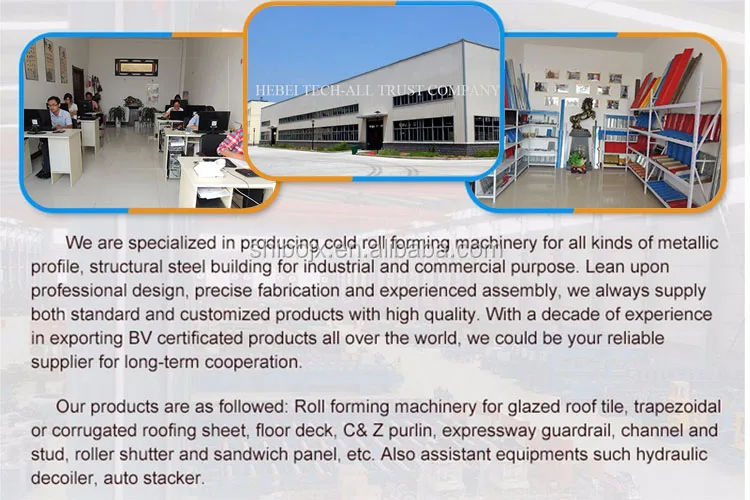 Of course we also produce 1.double deck roller forming machine 2.Ridge cap cold roll former machine 3.Floor decking rolling forming machine 4.light steel frame roll forming machine 5.roller door shutter roll forming machine 6.sandwich panel roll forming machine 7.U purline roll forming machine 8.Gutter&Downspout roll forming machine 8.shelf&rack roll forming machine 9.welding pipe and tube roll forming machine. In recent years, our products at large scales have been sold to more than 50 countries and regions, for instance, France, Britain, Australia, The United States, Kazakhstan, Malaysia, Nigeria, Rumania, Albania, etc, and has won the universal appreciation and commendation from the customers all over the world.Roofing And Wall Sheet Cold Rolling Making Machinery Welcome to Contact us and visit us!