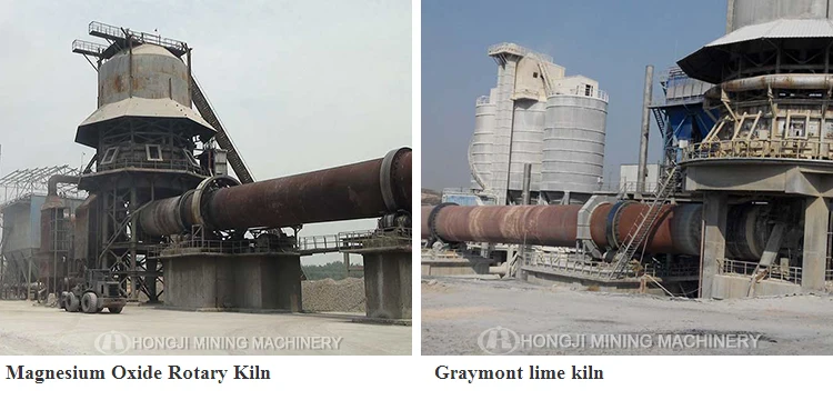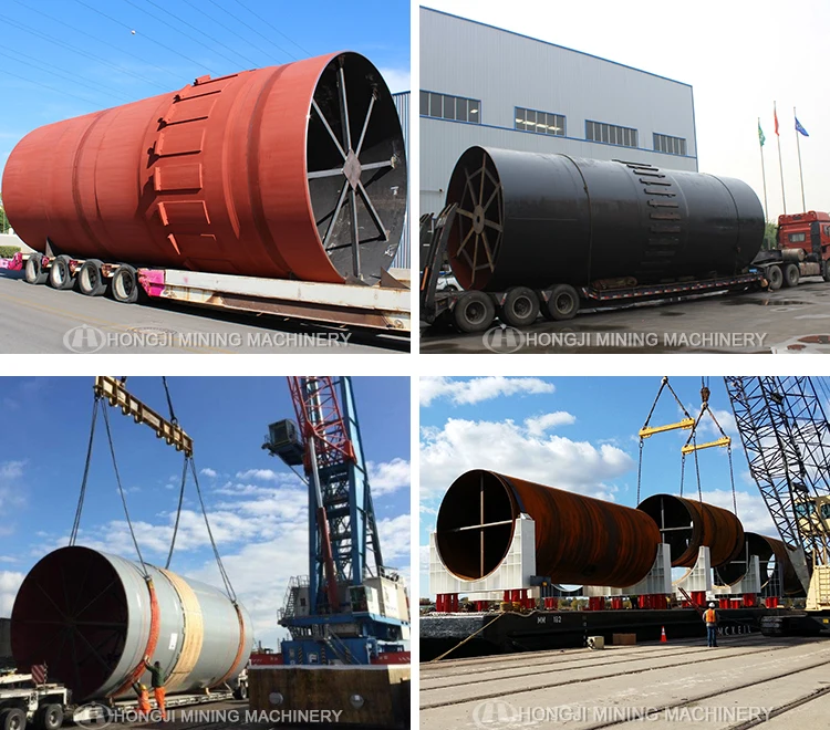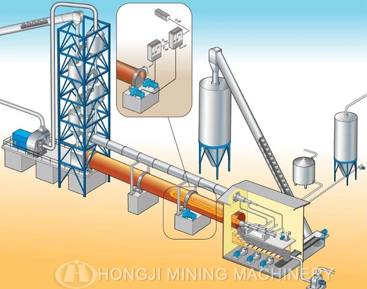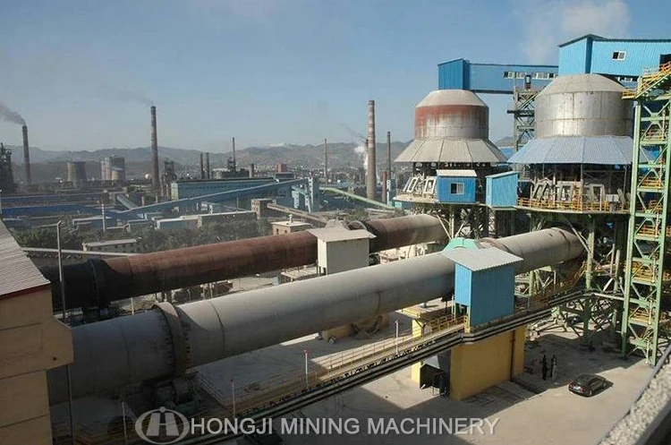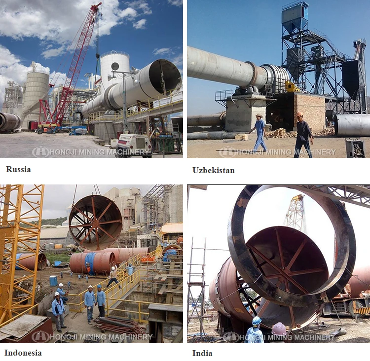 The rotary kiln from china professional manufacture Hongji Group Machinery is a cylindrical vessel, inclined slightly to the horizontal, which is rotated slowly around its axis. The material to be processed is fed into the upper end of the cylinder. As the kiln rotates, the materials gradually move down towards the lower end, and may undergo a certain amount of stirring and mixing. Hot gases pass along the kiln sometimes in the same direction as the process material (co-current), but usually in the opposite direction (counter-current). The hot gases may be generated in an external furnace, or may be generated by a flame inside the kiln. Such a flame is projected from a burner-pipe (or 'firing pipe') which acts like a large burner. The fuel may be gas, oil or pulverized coal.