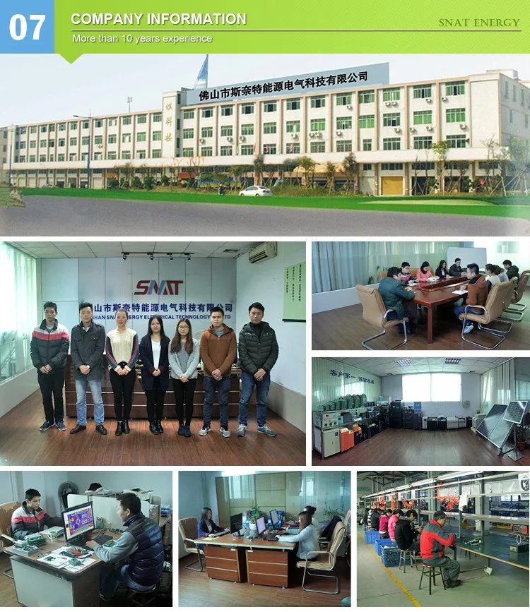 Foshan SNAT Energy Electrical Technology Co. Ltd is established in 2004. As a world's leading supplier for solutions for electric energy and new energy, SNAT has powerful strength and is engaged in field of solar inverters, solar inverters with built-in solar controller, solar controllers, UPS, which are used for household, telecommunication, electricity, infrastructure and industrial markets. At the same time, our company is concurrently engaged in solar panels, batteries for solar power system. All products purchased by our company have our warranty commitment, parts will be shipped for free during warranty period. We have professional technical team and are focus on customers' demands, continuous innovation, and establish good cooperation with more and more clients. The leading-edge technology has become a competitive advantage for our customers and business. SNAT is becoming a strong brand step by step depending on high quality and strict self-demanding. We have won a good reputation among clients.