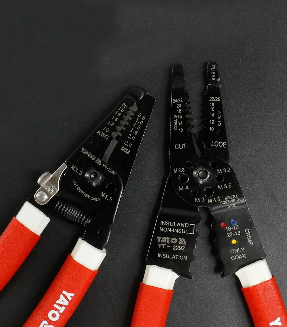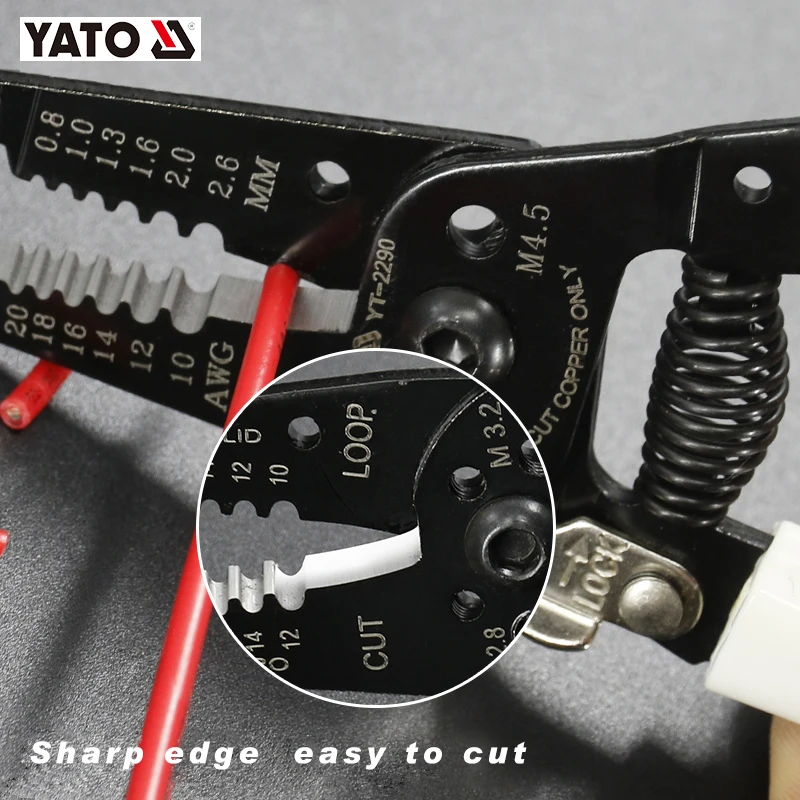 | LENGTH: 185MM; THICKNESS: 3MM; MATERIAL: 65MN; HRC 50-53; WIRE STRIPPER 10-22 AWG / 0,64-2,6 MM2; WIRE CUTTER; COPPER BO LT CUTTER; WITH LOCK; WITH SPRING; DOUBLE DIPPPED HANDLE |
