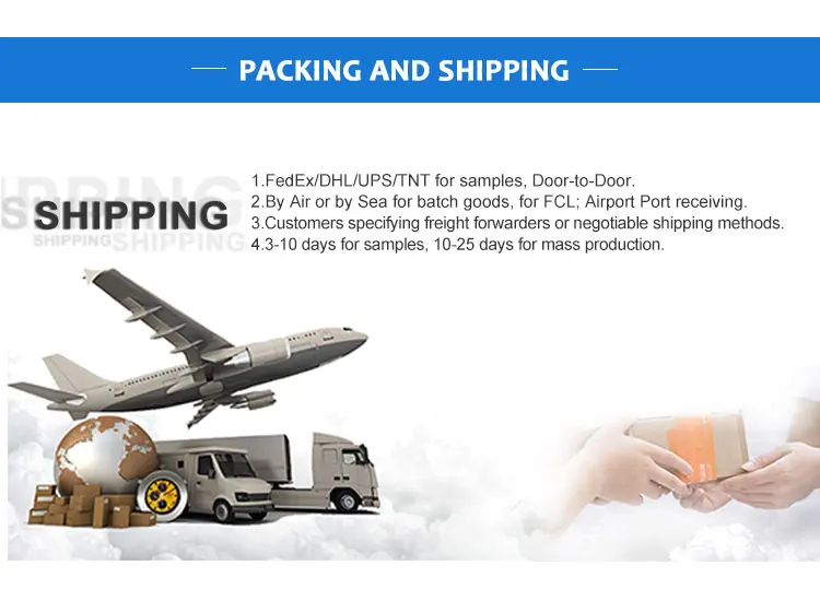 A: Sample with stock: 1-3 days after receiving full payment. New sample: 2-7 days after receiving full payment. Mass production: 5-20 days after receiving 30% deposit.