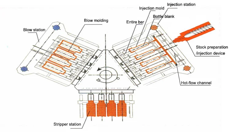 First, during the operation of the machine, the raw material is withdrawn from the hopper to the extruder barrel & screw assembly, which is melted to form a polymer. The molten polymer is fed into the hot runner tube and injected into the cavity and core pin by means of a nozzle injection which forms an outer shape and is clamped around the formed inner mandrel and then the first complement, in the injection device, Forming the preform (preform), the second step in the 360 degree rotating table rotation 120 degrees, to reach the blow molding device, and then in accordance with the size of the blow mold, the embryo blown into the product, the third step, stripping The When the mold is slightly cooled, there will be baffle to retract the mold and transport it to the destination using the conveyor.