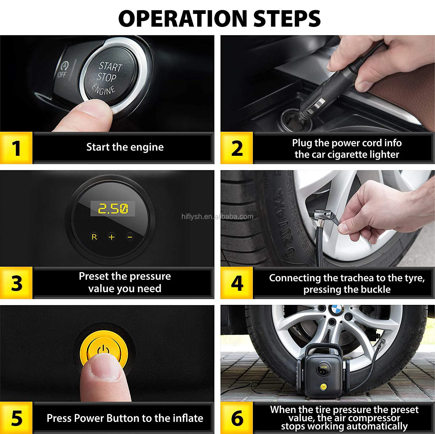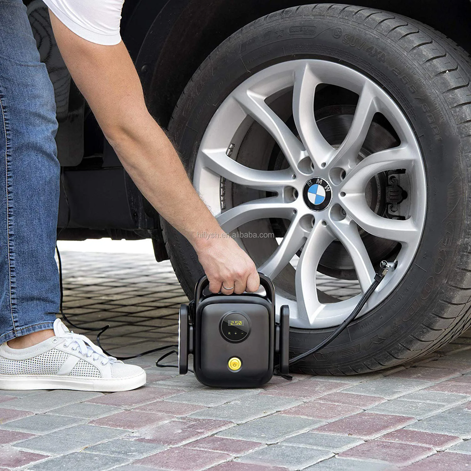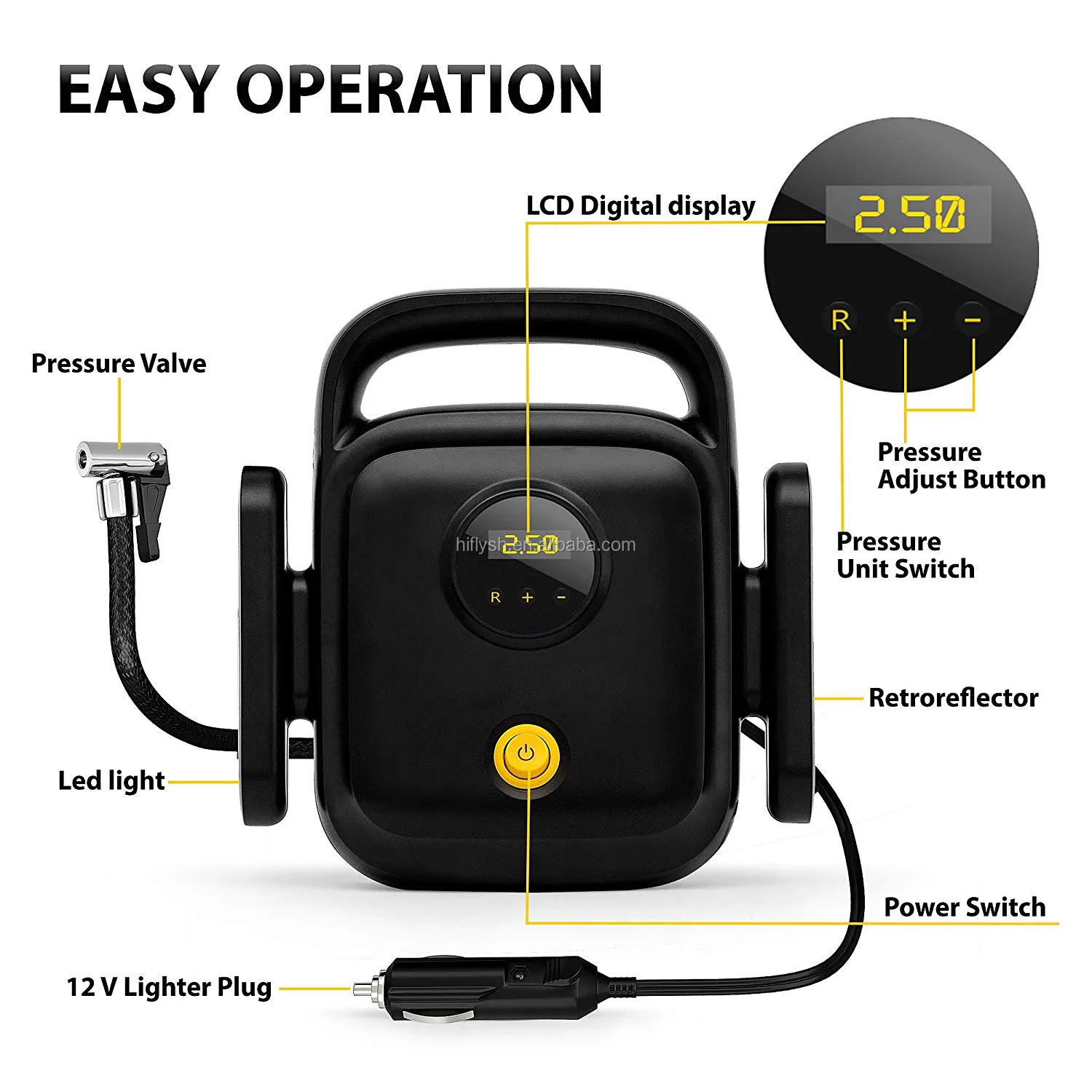 Big clear LED readout. Set preferred tire pressure: PSI, BAR, KPA. Auto shutoff : This intelligent tire inflator will auto shutoff after reaching your desired PSI. LED light :INFLY digital tire pump is equipped with bright and long-lasting LED lights, easy to use even in the dark. Hidden cords : Easy storage without a mess. Compact & Lightweight: Easy to carry, be your emergency helper. Long power cord: three-inch power cord will allow you to reach any car wheel.