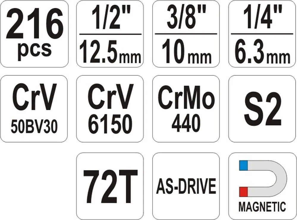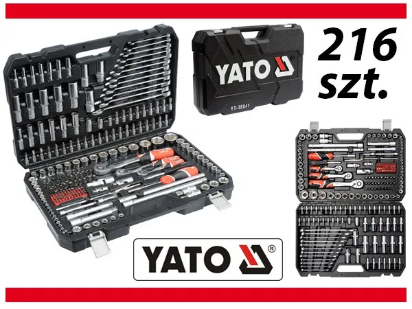 | 216PCS; 1/2" <(>&<)> 3/8" <(>&<)> 1/4"; ALL SOCKETS: 6PT, MATERIAL: CRV 50BV30, 2 TONE WITH LATHE KNURLING, 1/2''DR. REGULAR, DIN 3121, AS-DRIVE, LENGTH: 38/42MM, 15PCS (YT-1203 - 10MM/ YT-1204 - 11MM/ YT-1205 - 12MM/ YT- 1206 - 13MM/ YT-1207 - 14MM/ YT-1208 - 15MM/ YT-1210 - 17MM/ YT-1212 - 19MM/ YT-1213 - 20MM/ YT-1214 - 21MM/ YT-1215 - 22MM/ YT-1217 - 24MM/ YT-1218 - 27MM/ YT-1219 - 30MM/ YT-1220 - 32MM), 3/8''DR. REGULAR, DIN 3121, AS- DRIVE, LENGTH: 28/30MM, 10PCS (YT-3805 - 10MM/ YT-3806 - 11MM/ YT-3807 - 12MM/ YT-3808 - 13MM/ YT-3809 - 14MM/ YT-3810 - 15MM/ YT-3811 - 16MM/ YT-3812 - 17MM/ YT-3813 -18MM/ YT-3814 - 19MM), 1/4''DR. REGULAR, DIN 3121, AS-DRIVE, LENGTH: 25MM, 13PCS (YT-1401 - 4MM/ YT-1402 - 4.5MM/ YT- 1403 - 5MM/ YT-1404 - 5.5MM/ YT-1405 - 6MM/ YT-1406 - 7MM/ YT-1407 - 8MM/ YT-1408 - 9MM/ YT-1409 - 10MM/ YT-1410 - 11MM/ YT-1411 - 12MM/ YT- 1412 - 13MM/ 14MM); 1/2"DR. DEEP, DIN 3121, AS-DRIVE, LENGTH: 76MM, 5PCS (YT-1229 - 16MM/ YT-1230 - 17MM/ YT-1231 - 18MM/ YT-1232 - 19MM/ YT-1235 - 22MM), 3/8"DR. DEEP, DIN 3121, AS-DRIVE, LENGTH: 63MM, 6PCS (YT-3824 - 10MM/ YT-3825 - 11MM/ YT-3826 - 12MM/ YT-3827 - 13MM/ YT-3828 - 14MM/ YT-3829 - 15MM), 1/4"DR. DEEP, DIN 3121, AS-DRIVE, LENGTH: 50MM, 7PCS (YT-1413 - 4MM/ YT-1415 - 5MM/ YT-1417 - 6MM/ YT-1418 - 7MM/ YT-1419 - 8MM/ YT-1420 - 9MM/ YT-1421 - 10MM); STAR SOCKET 1/2''DR., 6PT, CRV 6150, 3PCS (E20, E22, E24), 3/8''DR., 6PT, CRV 6150, 6PCS (E10, E11, E12, E14, E16,E18), 1/4''DR., 6PT, CRV 6150, 5PCS (E4, E5, E6, E7, E8); EXTENSION BAR 1/2"DR., CRV 50BV30, LENGTH: 127MM (YT-1247), 1/2"DR., CRV 50BV30, LENGTH: 254MM (YT-1248), 3/8"DR., CRV 50BV30, LENGTH: 125MM, 1/4"DR., CRV 50BV30, LENGTH: 50.8MM (YT-1429), 1/4"DR., CRV 50BV30, LENGTH: 101.6MM (YT-1431); UNIVERSAL JOINT 1/2"DR., CRV 50BV30 (YT- 1252), 3/8"DR., CRV 50BV30 (YT-3850), 1/4"DR., CRV 50BV30 (YT-1437); SPARK PLUG SOCKET 1/2"DR., CRV 50BV30, LENGTH: 64MM, 16MM (YT-1253), 21MM (YT-1254), 3/8"DR., CRV 50BV30, LENGTH: 63MM, 18MM (YT-3841); SLIDING T-BAR 1/2"DR., CRV 40, LENGTH: 255MM (YT-1243), 1/4"DR., CR 40, LENGTH: 152.4MM (YT-1426); CURVED RATCHET HANDLE WITH TPR HANDLE 1/2"DR., LENGTH: 255MM, CRMO 440 (YT-0732), 3/8"DR., LENGTH: 200MM, CRMO 440 (YT-0731), 1/4"DR., LENGTH: 155MM, CRMO 440 (YT-0730); SPINNER HANDLE 1/4"DR., LENGTH: 150MM, CRV 50BV30 (YT-1427); SPINNER HANDLE WITH BIT ADAPTER 1/4”DR., LENGTH: 200MM, CRV6150; BIT ADAPTER 1/2"X5/16”, CRV 50BV30 (YT-1295), BIT ADAPTER 3/8"X5/16”, CRV 50BV30 (YT-1296); BIT ADAPTER 1/4"X1/4”, CRV 50BV30 (YT-1297); SCREWDRIVER BITS 5/16", S2, LENGTH: 30MM, 30PCS (SL: 6MM/ YT-7892 - 6.5MM/ YT-7893 - 8MM/; PH: YT- 7896 - PH3/ PH4/; PZ: PZ3/ PZ4/; TORX: YT-7900 - T25/ YT-7901 - T27/ YT- 7902 - T30/ T35/ 2X YT-7903 - T40/ YT-7904 - T45/ YT-7905 - T50/; TORX TAMPERPROOF: YT-7912 - T27/ YT-7913 - T30/ T35/ YT-7914 - T40/ YT-7915 - T45/ YT-7916 - T50/; HEX: 5.5MM/ YT-7921 - 6MM/ 6.5MM/ YT-7922 - 7MM/ YT-7923 - 8MM/; SPLINE: YT-7929 - M5/ YT-7930 - M6/ YT-7931 - M8/ YT- 7932 - M10), 1/4"DR., S2, LENGTH: 25MM, 44PCS (SL: YT-7801 - 4MM/ YT- 7803 - 5.5MM/ YT-7805 - 6.5MM/; PH: YT-7807 - PH1/ YT-7808 - PH2/; PZ: YT-7810 - PZ1/ YT-7811 - PZ2/; TORX: YT-7813 - T8/ YT-7814 - T10/ YT- 7815 - T15/ YT-7816 - T20/ YT-7817 - T25/; TORX TAMPERPROOF: YT-7821 - T8/ 2X YT-7822 - T10/ 2X YT-7823 - T15/ 2X YT-7824 - T20/ 2X YT-7825 - T25/ YT-7828 - T40/; HEX: YT-7831 - 3MM/ YT-7832 - 4MM/ YT-7833 - 5MM/ YT-7834 - 6MM/; HEX TAMPERPROOF: 3MM/ 4MM/ 5MM/ 6MM/; SPLINE: M5/ M6/ M8/; SQUARE: S1/ S2/; TRI-WINGS: 1MM/ 2MM/ 3MM/; FOUR WINGS: 6MM/ 8MM/ 10MM/; SPANNER: 4MM/ 6MM/ 8MM); BIT SOCKETS 1/2"DR., AISI S2/ CRV6150, LENGTH: 50MM, 2PCS (TORX: YT-7720 - T55/ YT-7721 - T60), 1/4"DR., AISI S2/ CRV6150, LENGTH: 37MM, 30PCS (SL: 6MM/ YT-7681 - 6.5MM/ 8MM/; PH: YT-7675 - PH3/ PH4/; PZ: YT-7678 - PZ3/ PZ4/; TORX: YT-7664 - T25/ T27/ YT-7665 - T30/ T35/ 2X YT-7666 - T40/ T45/ T50/; TORX TAMPERPROOF: T27/ T30/ T35/ T40/ T45/ T50/; HEX: 5.5MM/ YT-7670 - 6MM/ 6.5MM/ YT-7671 - 7MM/ YT-7672 - 8MM/; SPLINE: M5/ M6/ M8/ M10); COMBINATION SPANNER DIN 3113, AS-DRIVE, CRV, 12PCS (YT-0337 - 8MM/ YT-0339- 10MM/ YT-0340 - 11MM/ YT-0341 - 12MM/ YT-0342 - 13MM/ YT-0343 - 14MM/ YT-0344 - 15MM/ YT-0345 - 16MM/ YT-0346 - 17MM/YT-0347 - 18MM/ YT-0348 - 19MM/ YT-0351 – 22MM); HEX KEY CRV 6150, 7PCS (1.27, 1.5, 2, 2.5, 3, 4, 5MM) |