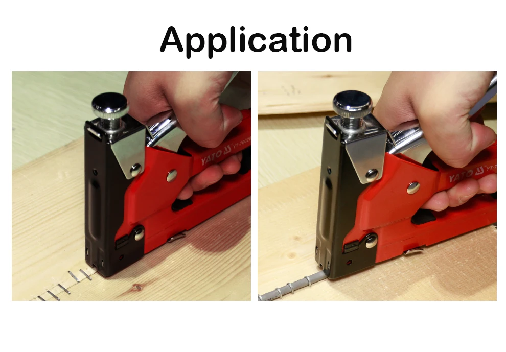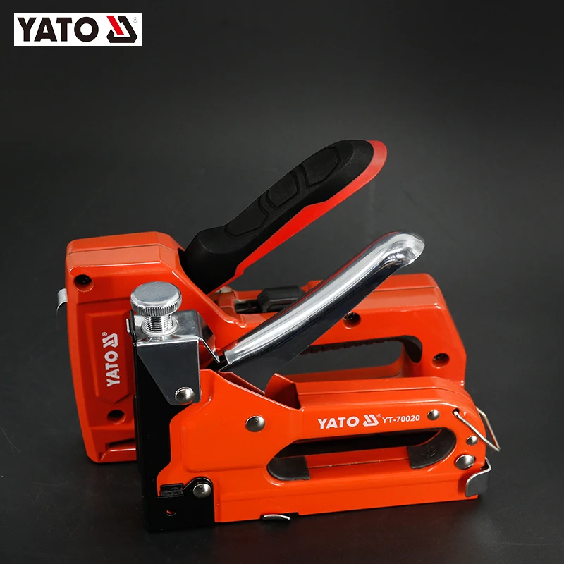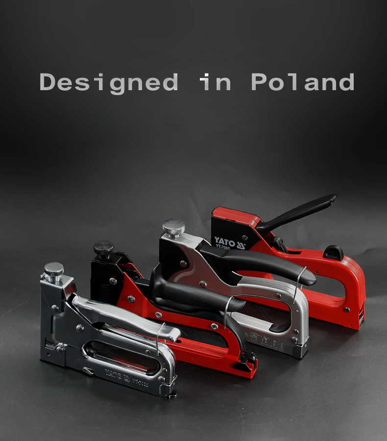 Upholstery stapler designed to quickly combine various materials, e.g. wood, with fabrics, cardboard, paper or leather. Used in upholstery, roofing, decorating, building finishes etc. It combines materials with a steel staple driven in with great force. The stapler is intended for driving typical steel, rectangular staples in the length range from 6-16mm. Stapler with beater spring pressure regulation - adjustable impact force.