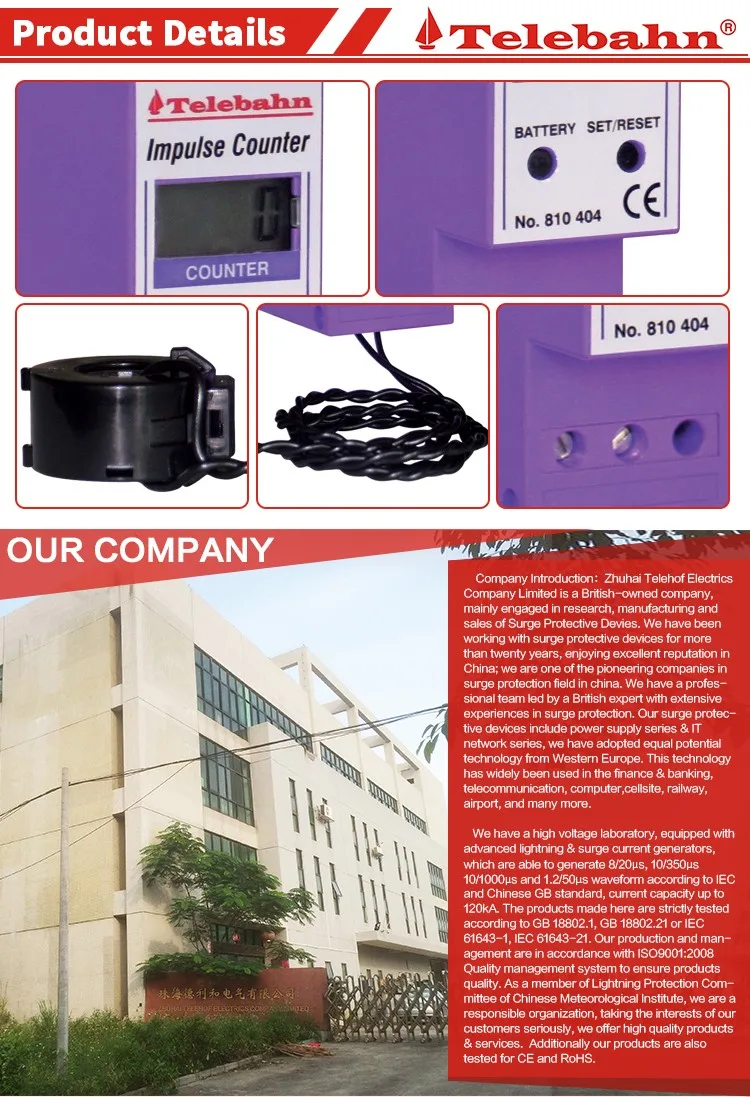 For counting the number of current discharges by surge protective devices to earth. The counter with 3V battery and battery low indication, 3 digits or 4 digits LCD display with set and reset function.