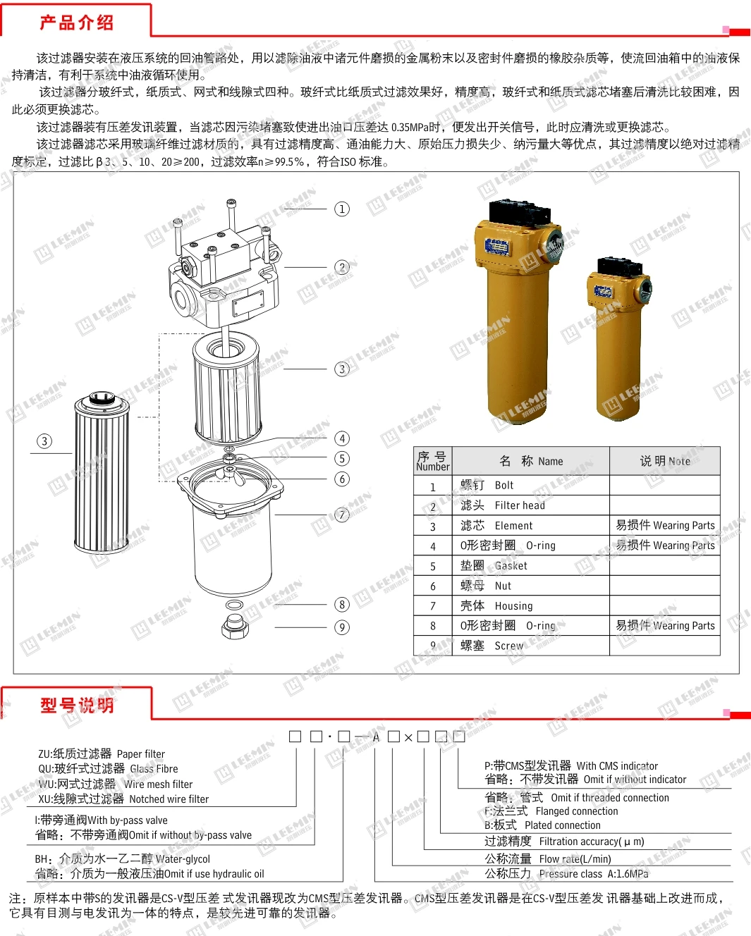 The filter is installed in the oil return pipeline of the hydraulic system to remove the metal powder worn by various components and rubber impurities worn by seals in the oil, so as to keep the oil flowing back to the oil tank clean and facilitate the circulation of oil in the system.