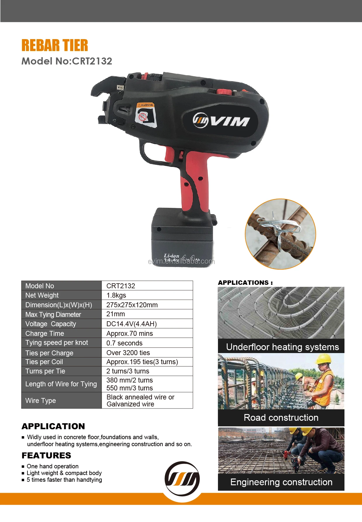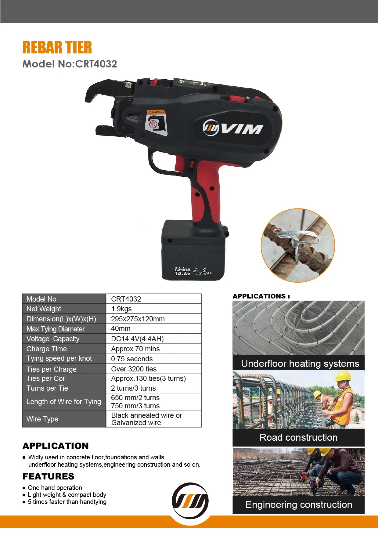 | Wire Length per Tie: | 650 mm/ 2 turns, 750 mm/ 3 turns, 380 mm/ 2 turns, 550 mm/ 3 turns; | Charge Time: | 70 mins; |