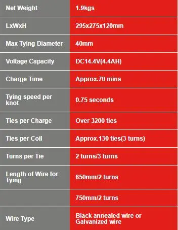 | Ties per Charge: | over 3200 ties; | Tying Speed per Knot: | 0.75 seconds, 0.7 seconds; |