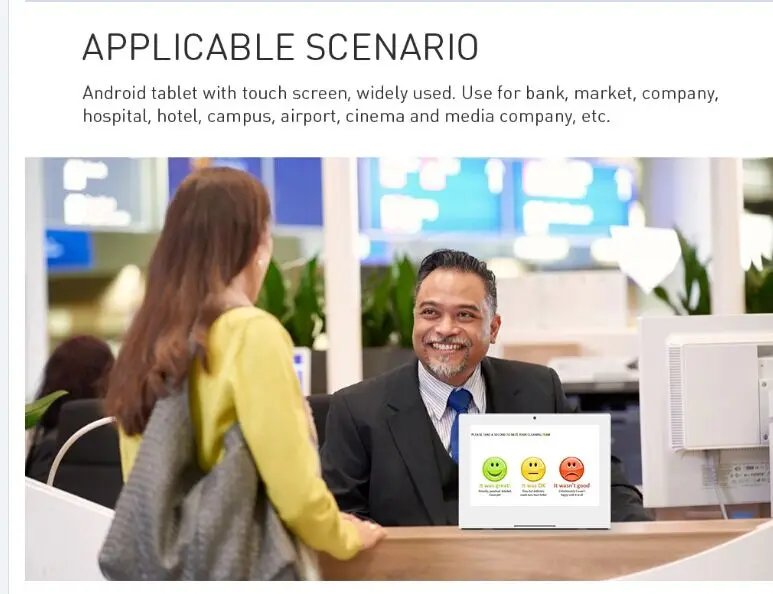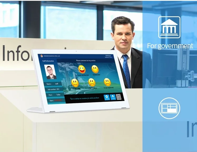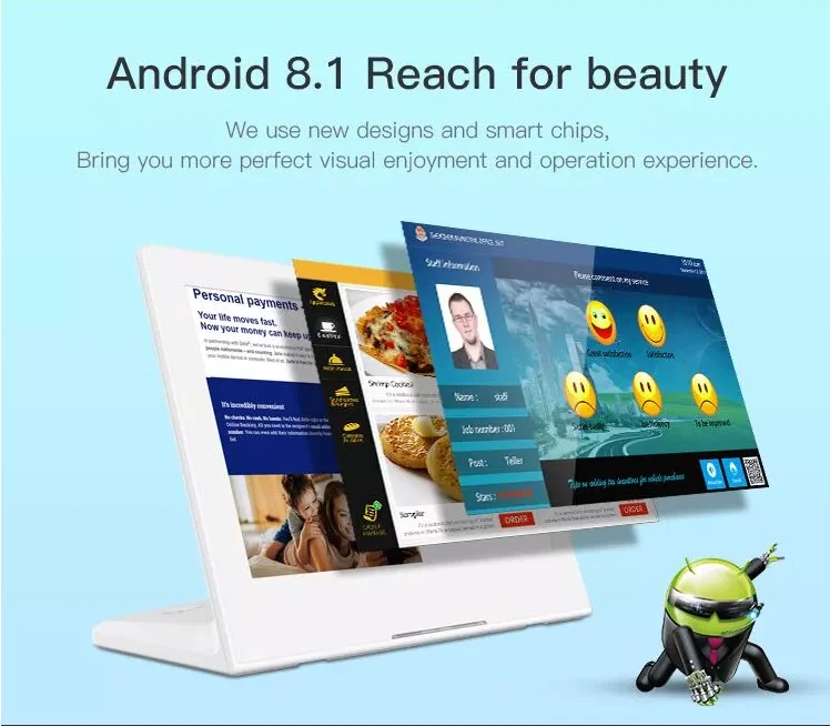 All in one touch screen pc 10.1 inch android tablet pc is Quad core cortx A17,1.8G,RK3288 with RAM 2GB,internal memory 16GB and 10.1"LCD IPS panel,resolution of 1280*800, with front camera,speaker and bluetooth. Wide range of uses: For banks, shopping malls, businesses, hospitals, hotels, campuses, airports, cinemas, media companies.