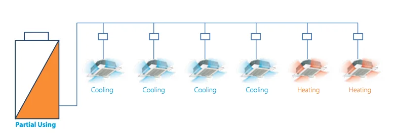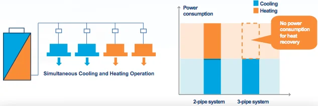 Simultanes heating and cooling in different zones, more energy saving by heat recovery from one space to another which saves up to 50% in costs compared with a convenitional heat pump system.