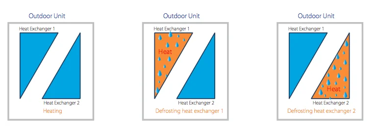 Each heat exchanger is defrosted by using heat transferred from one heat exchanger to the other in the outdoor unit. Defrost has no impact on the indoor unit on heating mode.