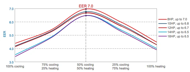 Heat recovery is achieved by diverting exhaust heat from indoor units in cooling mode to areas requiring heating, maximizing energy efficiency, reducing electricity costs and leading to high partload efficiencies (up to 7.0 in the 8HP category).