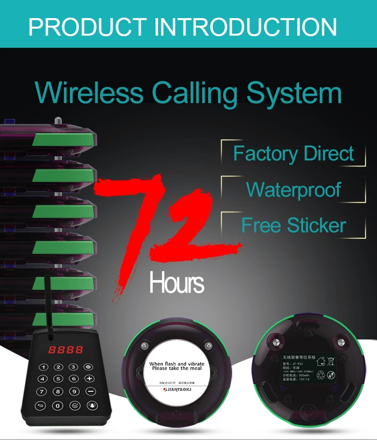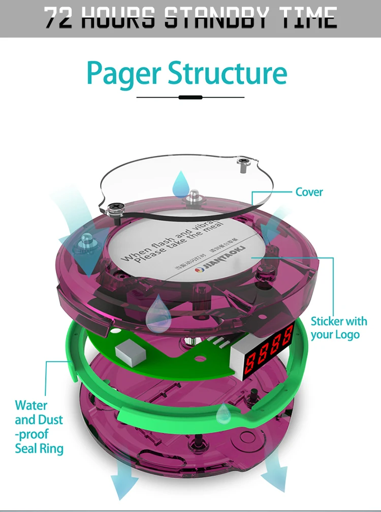 | Brand Name: | JIANTAO; | Product Name: | Waterproof Wireless Restaurant Guest Queue Food Coaster Pager; |