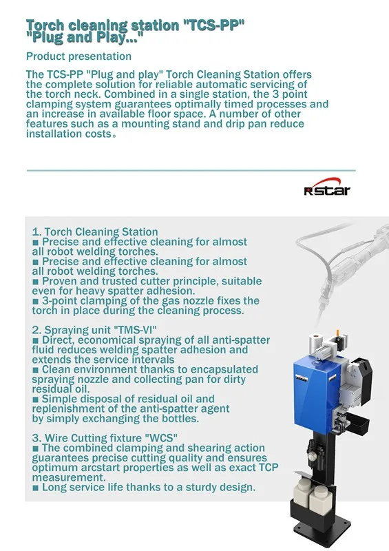 The TCS-PP "Plug and play" Torch Cleaning Station offers the complete solution for reliable automatic servicing of the torch neck. Combined in a single station, the 3 point clamping system guarantees optimally timed processes and an increase in available floor space. A number of other features such as a mounting stand and drip pan reduce installation costs。