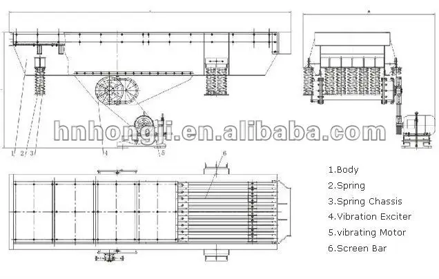 HONGJI Vibrating Feeder is a kind of linear direction feeding equipment. It is generally installed in front of the primary crusher, conveys big blocks continuously and evenly while removing the dirt and impurities by screen bars. As necessary equipment, it can effectively control the feeding capacity to match with the capacity of the whole crushing plant. In the Sand-Stone production line, it can send materials to crusher evenly and continuously and at the same time, it can screen materials roughly. It can be used in these areas such as metallurgical industry, coal mining industry, mining-selecting, building, chemical and grinding industry, etc.
