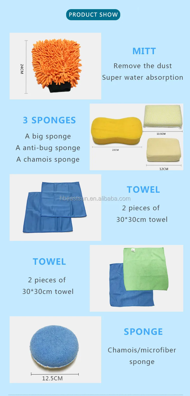 | Including | Mitt, 3 sponges, chamois/microfiber sponge and 4 cloth |