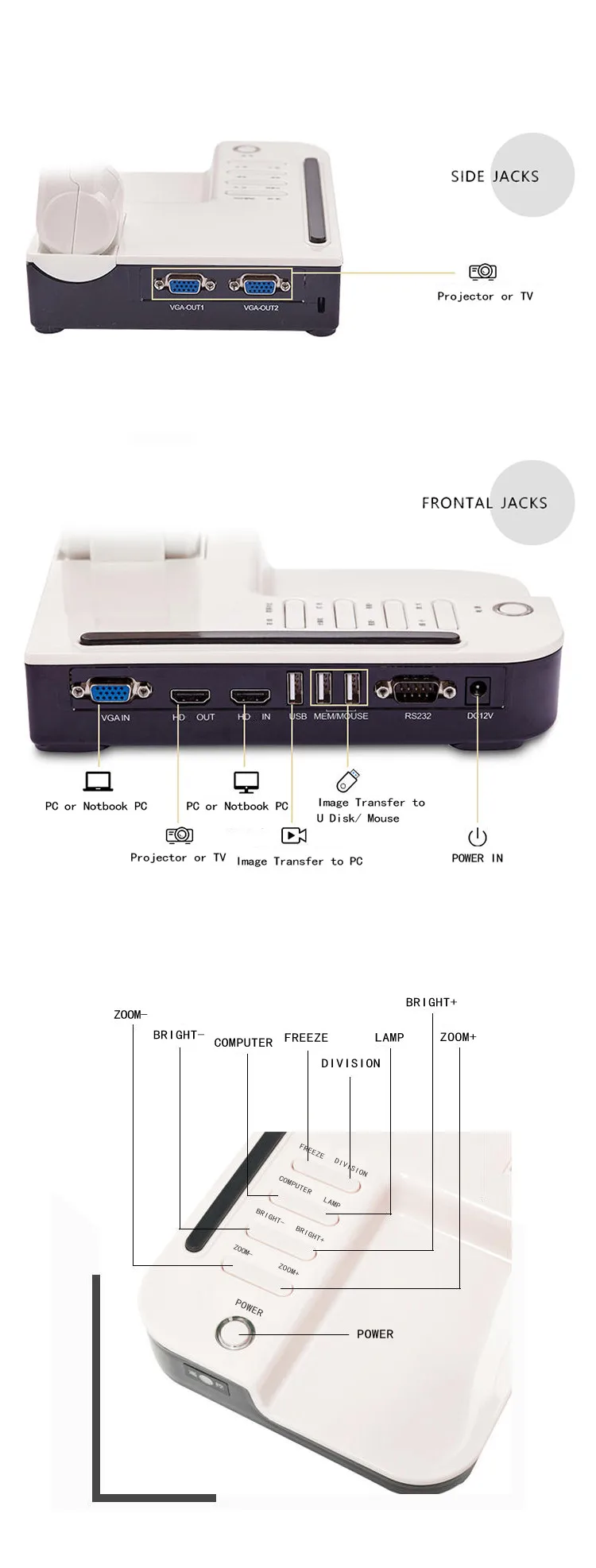 Function | Brightness adjustment, Negative/Positive, Image Zoom/Freeze/Split/Rotation/Mirror/text, Image TELE/WIDE, PC Interface, Color adjustment(Red & Blue), | ||
