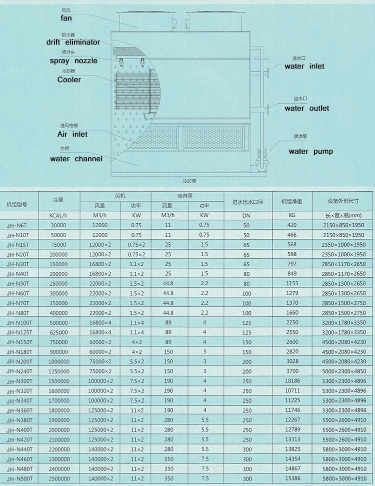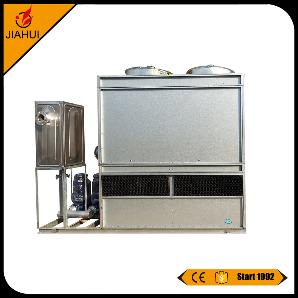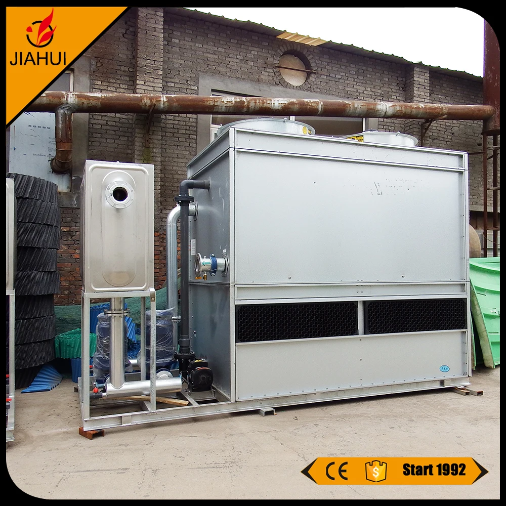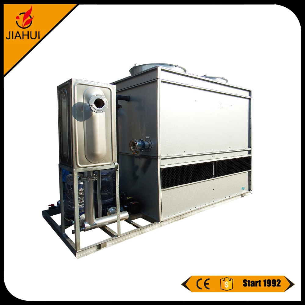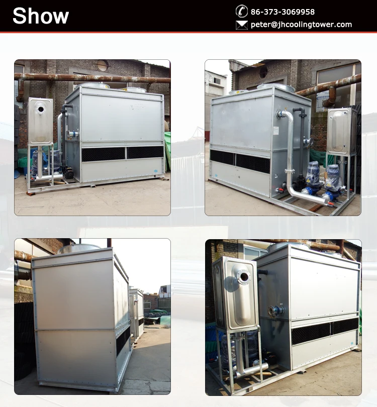 Closed cooling tower also named Evaporative air cooler. It is the type of cooling tower placed the heat exchange tube inner the tower to the then ensure the cooling effect by circulation of air, spray water and circulating water. Spray water wraped around the heat exchange tube, the heat of the water inner tube is transfered to the spary water throught the wall of Heat exchange tube and Forming steam, the steam is discharged by fans. Almost Steam is recycling by drift eliminator , Re-condense into water and flow into the water channel. The filling cooling the spary water twice time , impoved the cooling effect and reduce the Scaling in outer wall of heat exchange tube.It can ensure the water can't be pulluted because of the close circulation and protect well the main equipment 's efficient operation and improve the service life. If the low temperature outside, can stop spray water system to save water, Closed cooling tower in the iron and steel metallurgy, power electronics, mechanical processing, air conditioning systems and other industries have been widely used.