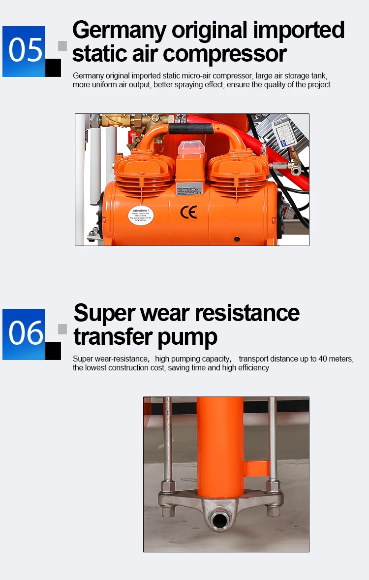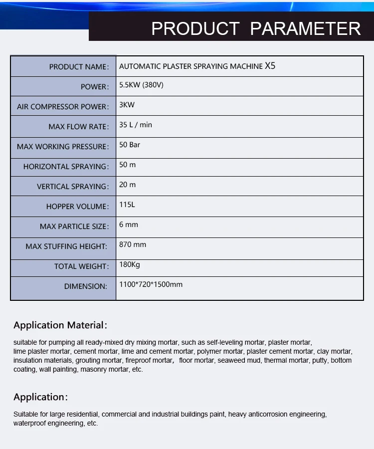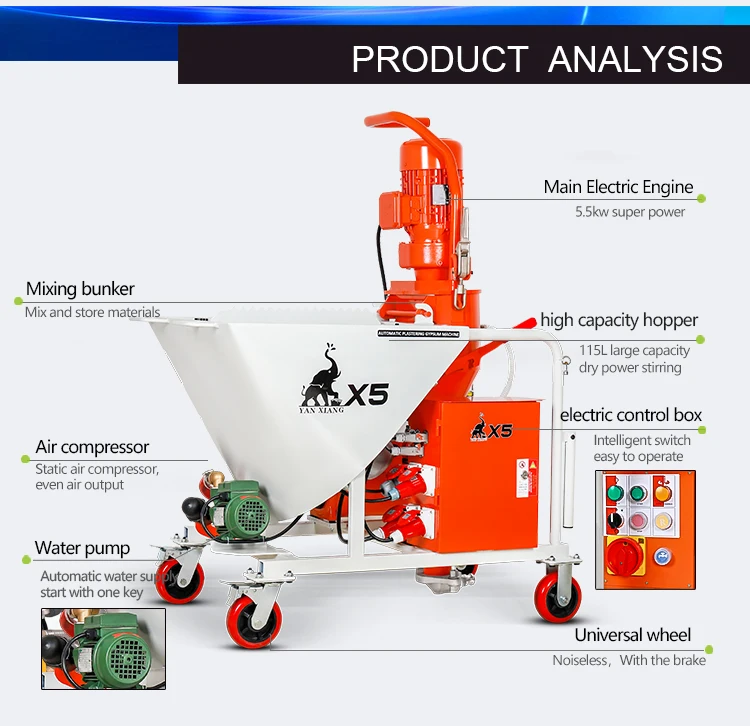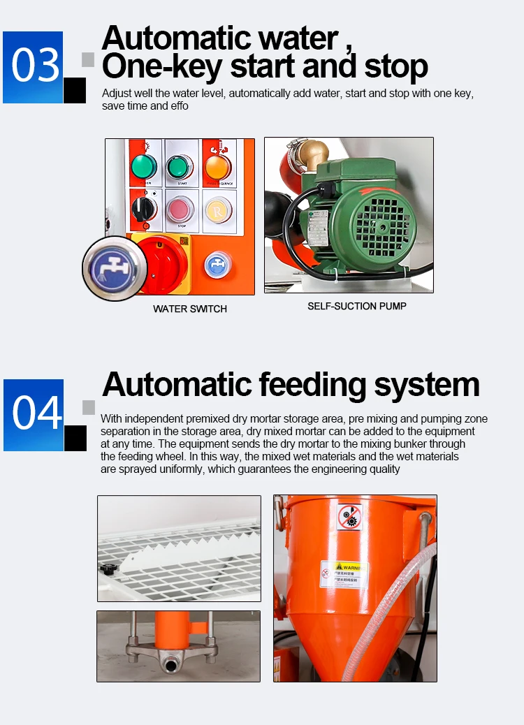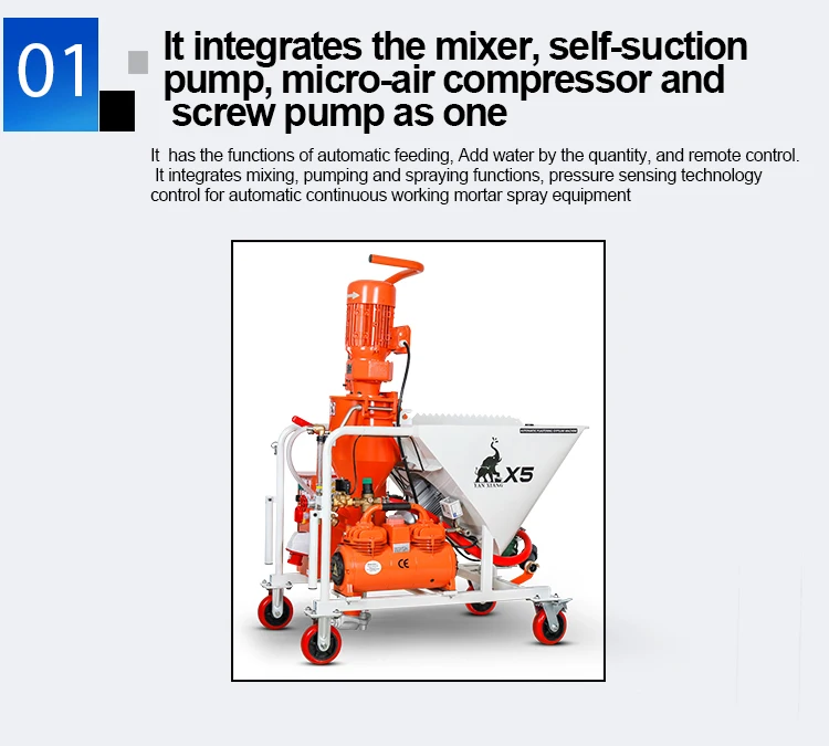 Multi-function spraying machine ,suitable for pumping all ready-mixed dry mixing mortar, such as self-leveling mortar, plaster mortar, lime plaster mortar, cement mortar, lime and cement mortar, polymer mortar, plaster cement mortar, clay mortar, insulation materials, grouting mortar, fireproof mortar,floor mortar, seaweed mud, thermal mortar, putty, bottom coating, wall painting, masonry mortar, etc. plaster spray machine