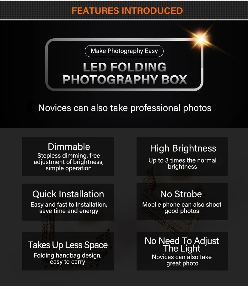 1. Simple and fast folding Led Box/Studio, only 3S installation & Folded as a handbag to carry