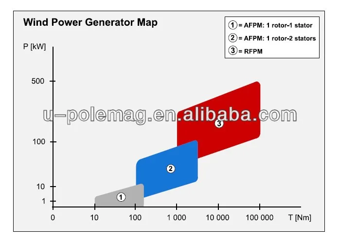 Operating range of PMG covers the needs of small wind turbine (SWT). For 1-5KW wind turbines, can use a single rotor-single stator of AFPMG, for 5KW-50KW turbines, can use AFPMG with a construction of single rotor-double stators.