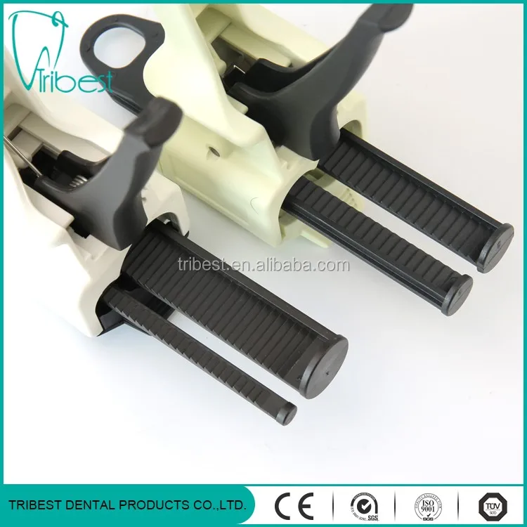 4. Prepare the lacunaris impression tray for the material. Pull the handle to squeeze impression materials steadily and symmetrically into dental tray. And the amount of impression materials needs to cover operating teeth and near.