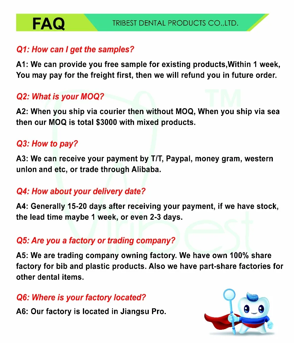 3.We have own 100% share factory for bib and plastic products.Also we have part-share factories for other dental items.
