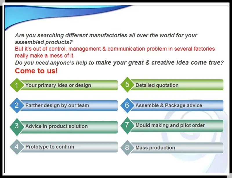 7-We offer unique solutions to your products with reasonable price, good quality and best service. |