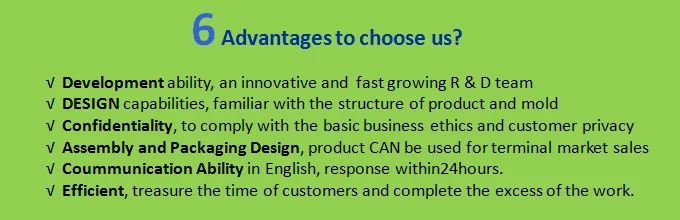 1.We are an manufacturer specialized in OEM injection plastic parts from design to rapid prototype to mold to mass production for more than 20 years. |