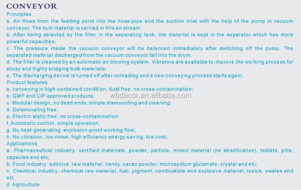 | Standard: | GMP/FDA; | Model Number: | WP430 Series Vacuum Conveyor; |