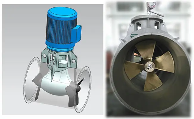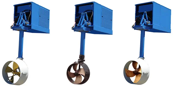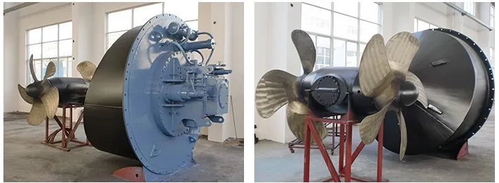 Azimuth thruster with tube are a kind of Z type propulsion combined with tube propellers and steering gear function. The part under water can steer by 360 degree free rotating. all-directional propulsive force is formed. The device combines the highly efficiency of tube propellers and flexibility of azimuth thruster. The device is mainly used for varied engineering ships with high flexibility or with dynamic positioning demand, such as harbor tugs, undersea cabling working ships, floating crane barges, marine platform and platform supply ships, and others. The power range of the products is from 60HP to 3500HP. |