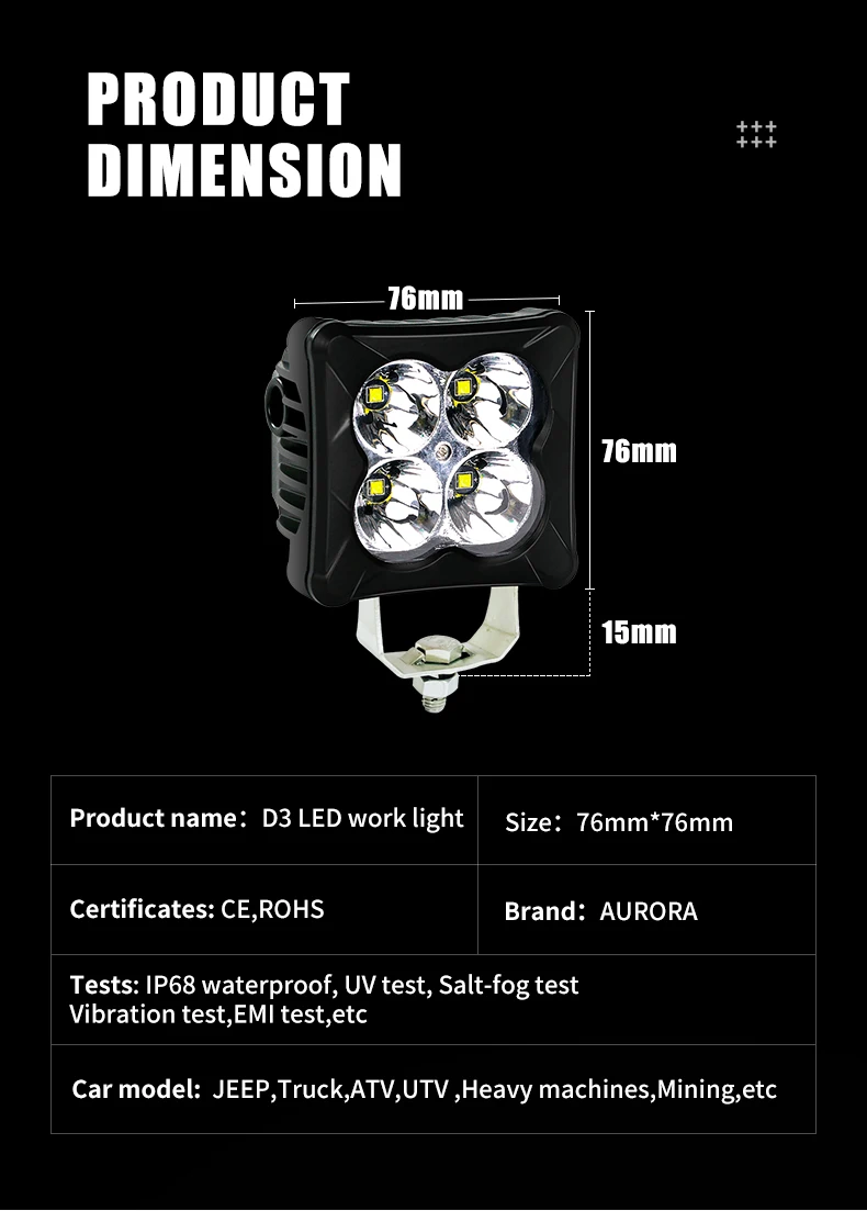 | waterproof grade: | IP68/IP69K; | Packaging Detail: | Aurora Standard package, led work light; |