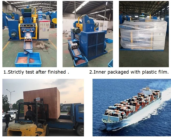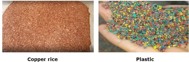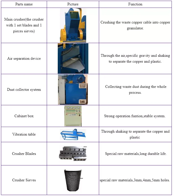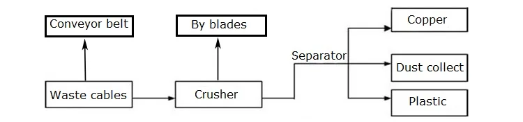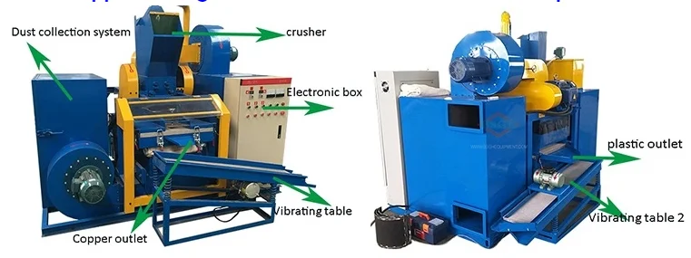 Due to plastic and copper has different in density,so the crusher need processing plastic first(by high quality blades),then separated by vibrator and suction together,Finally the copper comes out from front side,the plastic comes out in other side .Dust will be sent by duct to the dust collector.