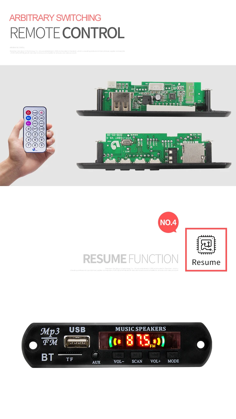 FM radio. USB and SDITF memory card, AUX. Remote control and Resume function are the basic functions. Besides. Bluetooth, Recording, Flash, Amplifier are customized functions for your choice.