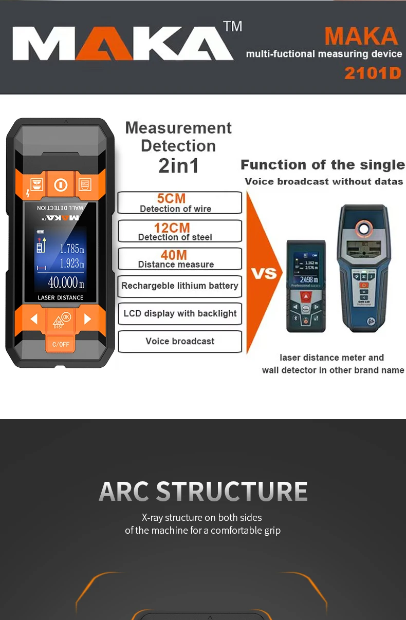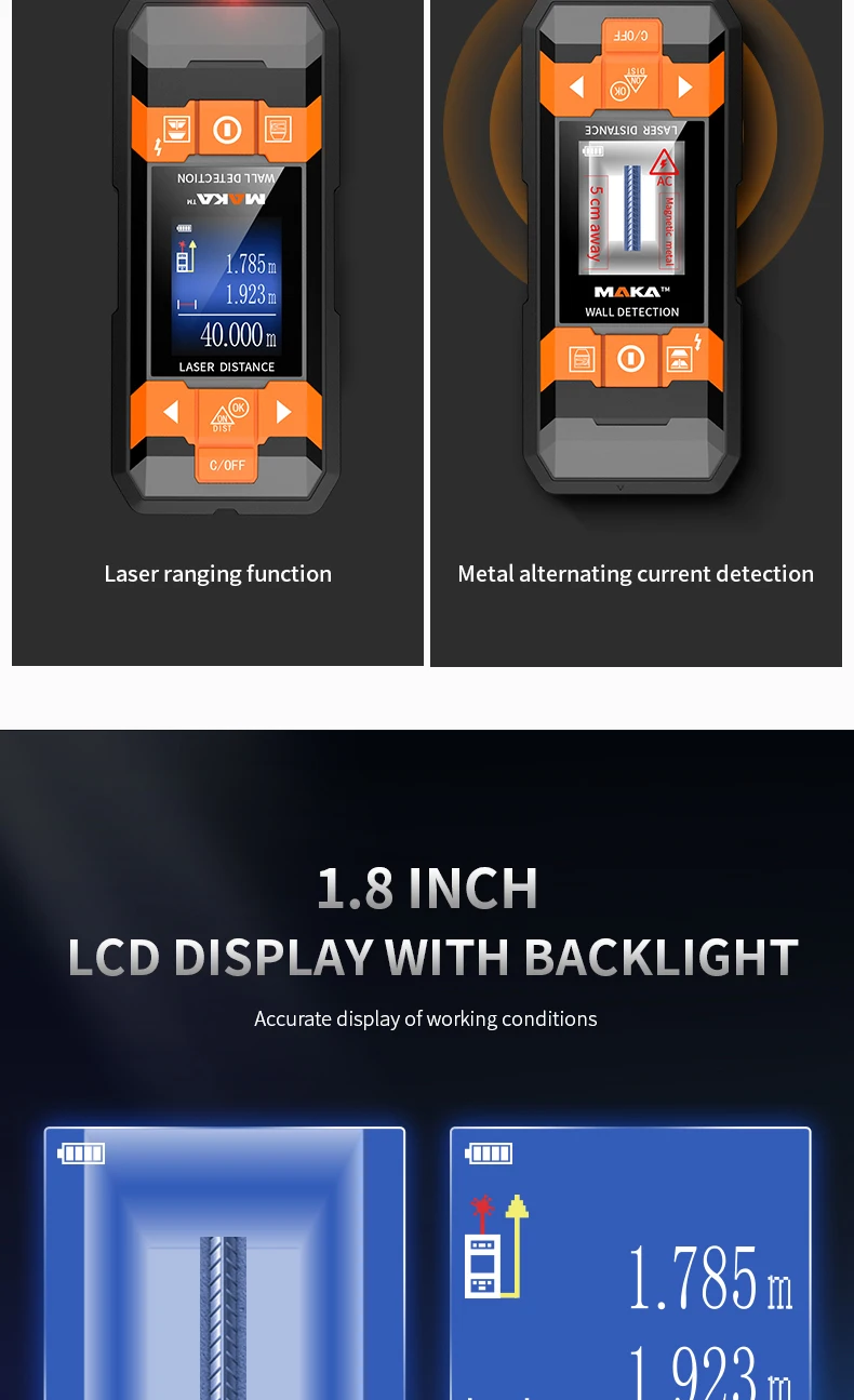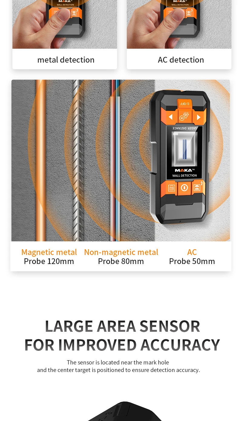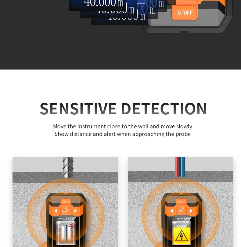 Maximum detection depth* | Ferrous metals 100mm Non-ferrous(Copper) 80mm Copper wires(≥mm² ) 40mm Foreign body(Wooden batten) 20mm/38mm |