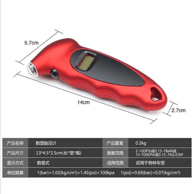 | Product name: | Hot Selling Led Digital Tire Gauge With LCD And Non-Slip Grip; | Single gross weight: | 1 KG; |