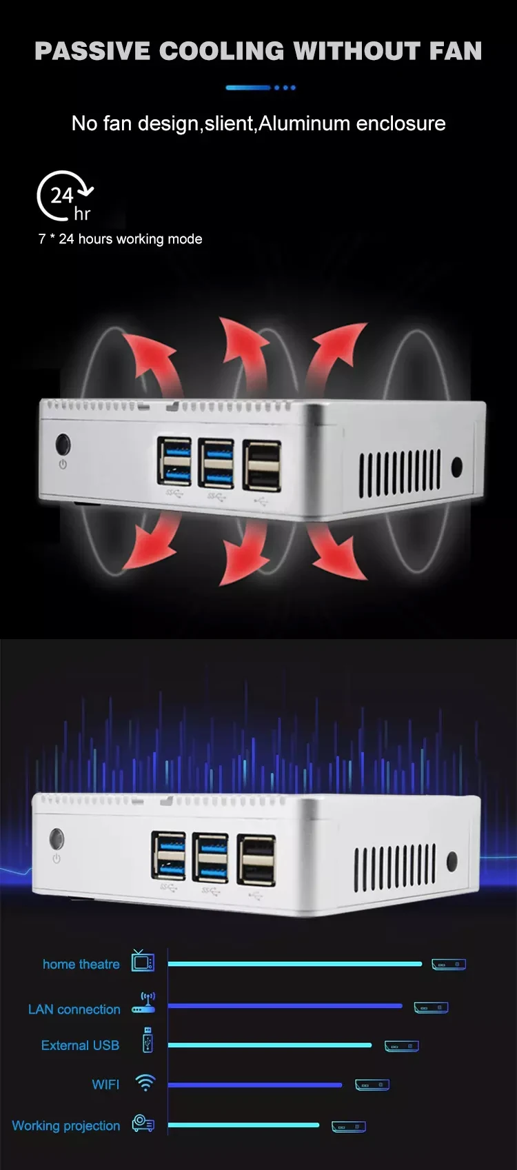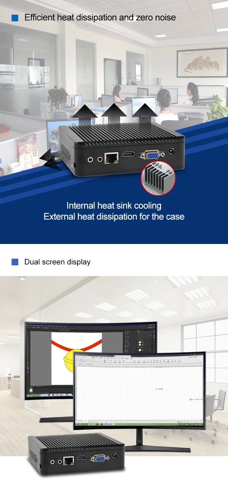 | Feature: | fanless industrial office mini pc; | Certificates: | CE FCC ROHS ISO9001 ISO14001; |