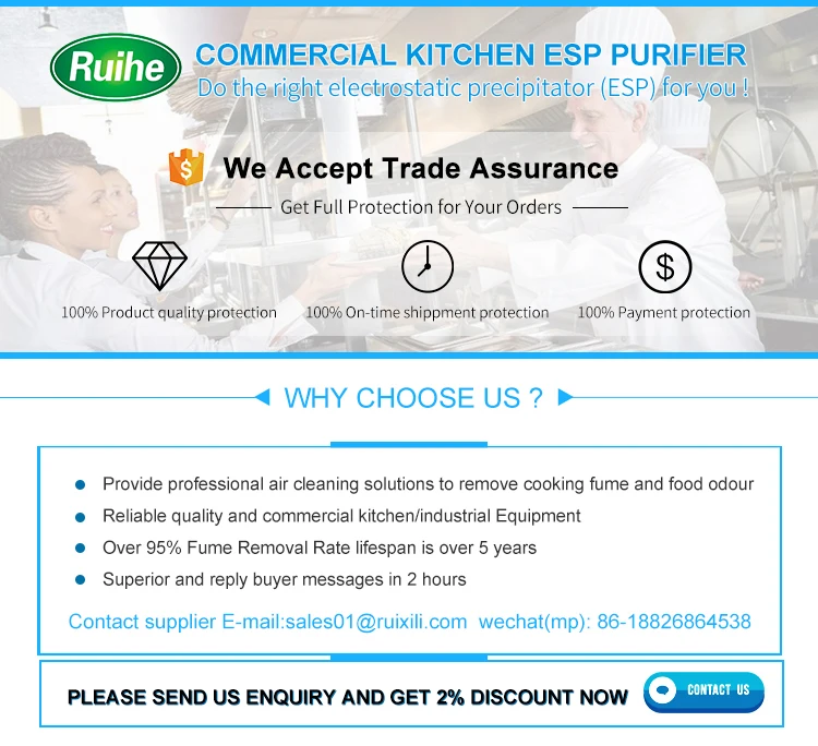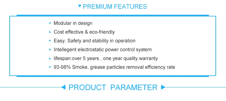 Electric intensity auto-control function ensures the Kitchen ESP Collector unit maintains a high purification rate after a long time service.