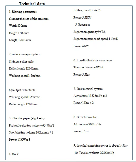 | Shot blasting volume: | 200kg/min x8; | Hoist: | 5.5kw; |