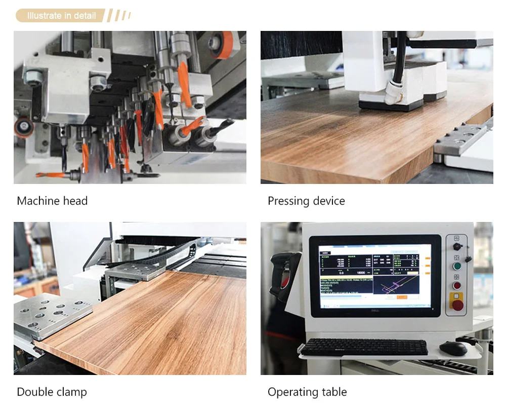 3.Equipped with front, rear, left, right and horizontal hole machining auxiliary pressure rollers; With alll-round auxiliary pressure processing to ensure the accuracy of horizontal hole machining during workpiece processing.