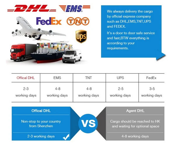 A: DHL/FedEx/UPS/EMS/TNT/by sea are accepted.