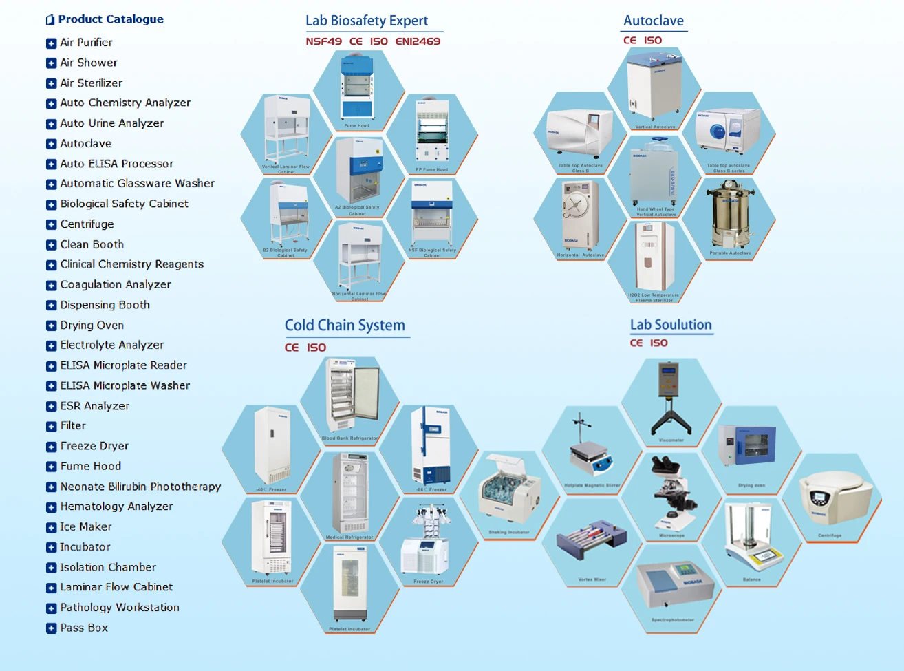 BIOBASE Group is specialized in products of 8 areas including medical diagnosis, biosafety protection, disinfection and sterilization, water purification system, infant care products, cold chain products, software products, clean room project.