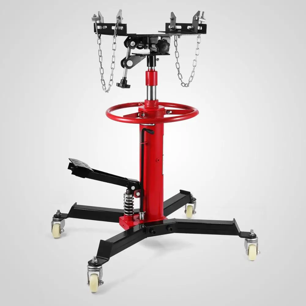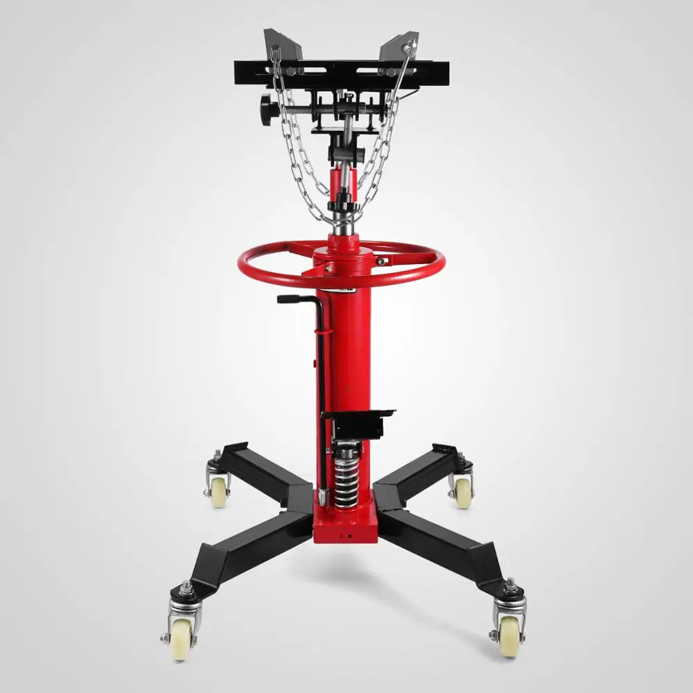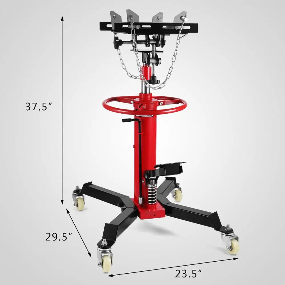 Two 26''long safety chains for securing the transmission on the saddle, The hydraulic transmission Jack is mainly used in high position installation and removal of automobile gearbox,car engines , conveyor of front and rear axles and other objects weighing no more than 500KG, It is a necessary lifting and convey tool for antomotive repair and maintenance facility.