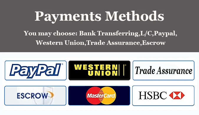 2. Paymemts: T/T(Bank Tranferring),L/C,Western Union,Paypal;30% deposit will be requested before mass production,70% balance should be paid before shipping.