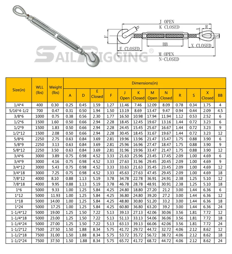 | Brand Name: | SailRigging; | Packaging Detail: | Wire Rope Turnbuckle:In gunny bag or carton then on steel pallets or some other ways according to customers' requirements.; |