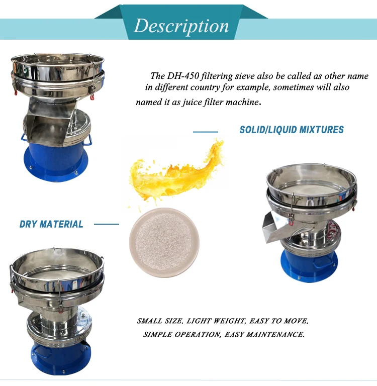 Dahan Sequins 450 Type Vibrating Filter Sieve liquid sieve shaker also named 450 type filter sieve is a kind of low noise, high efficiency, easy to move the small vibrating screen filter.It is to put the powder grain grading,liquid filtration combined as one of the single layer filter screen.Applicable to various industries manufacturers with a single screening and filtering. It is usually used in some products which is with less impurities.